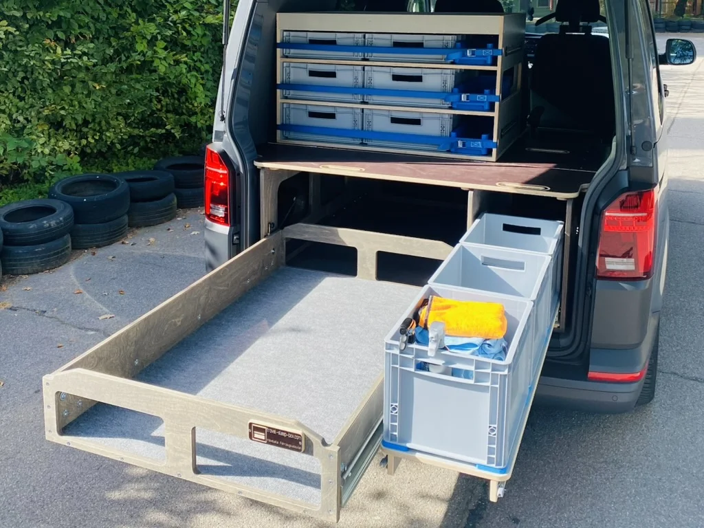 Das Transporter Basismodul ist die stabile Basis für deinen modularen Kofferraum-Ausbau. In der „Heavy Duty“ Ausführung mit extra langer Schublade bis 200kg belastbar. Ideal für Camping, Transport und flexible Nutzung. Passend für VW T5–T6.1.